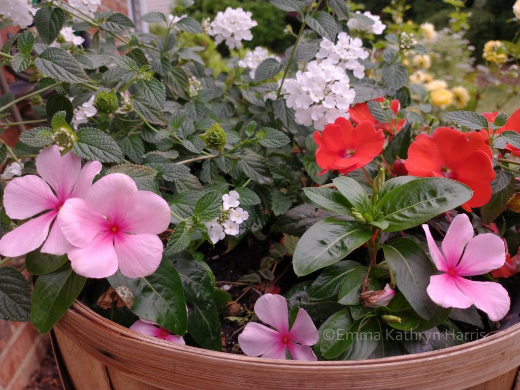 First, know your space where the flowers and plants will grow. Is it sunny or shady? Full sun, all day, will likely fry your plants. Even plants that require full sun need a little shade to give the soil a chance to cool and stay moist. Are you in a position where you can move the pots to a shady spot in the afternoon? Morning sun is less taxing on plants while afternoon sun is more harsh. If you can move the pots around and you don’t mind taking the time to do so, and the pots aren’t too heavy, this could help the sun/shade space challenge.