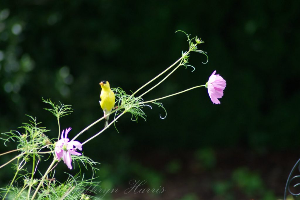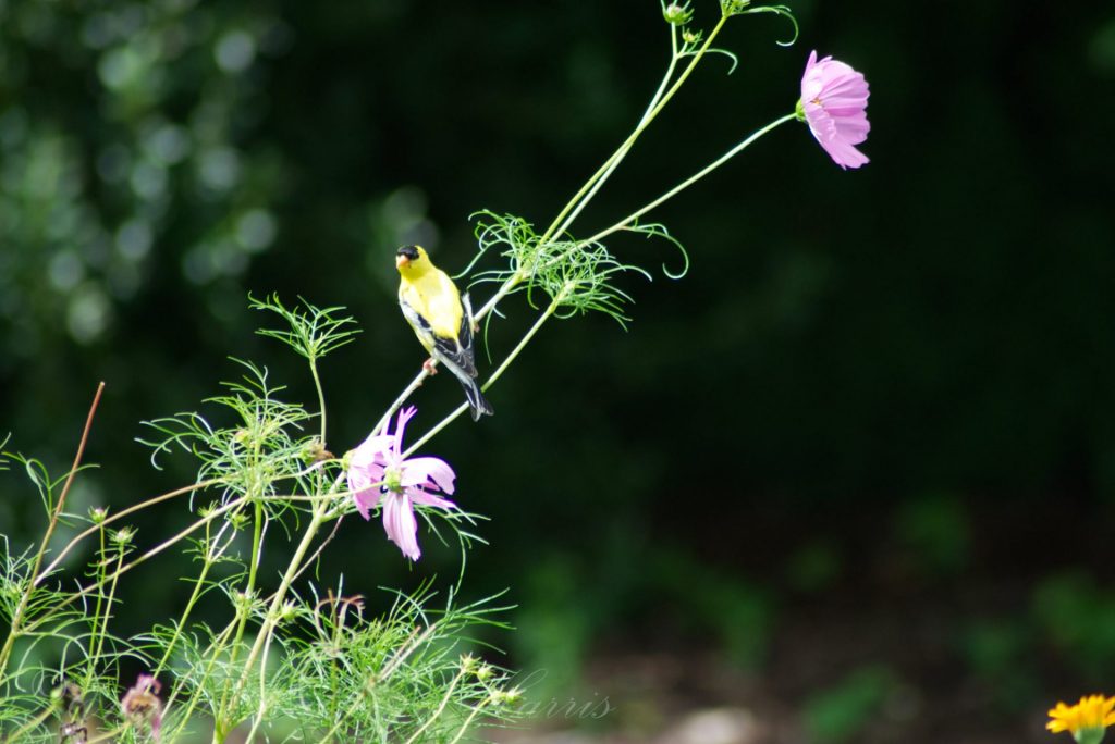 All the birds appear elated. I disturb them, though, when I step outside, and I watch as a group of goldfinches, sparrows, and Eastern bluebirds suddenly appear out of the garden, the flowers camouflaging them as they search for seeds in the ground or the pistils of the flowers. Their wings flap, sounding like a sheet when given a quick shake before being spread on the bed. They retreat to the nearest Dogwood tree. Eventually, as I sit still writing, they return and resume their activities. The goldfinch has a soft, sweet chirp, and will cling to the stem of the cosmos, content, sure of itself.